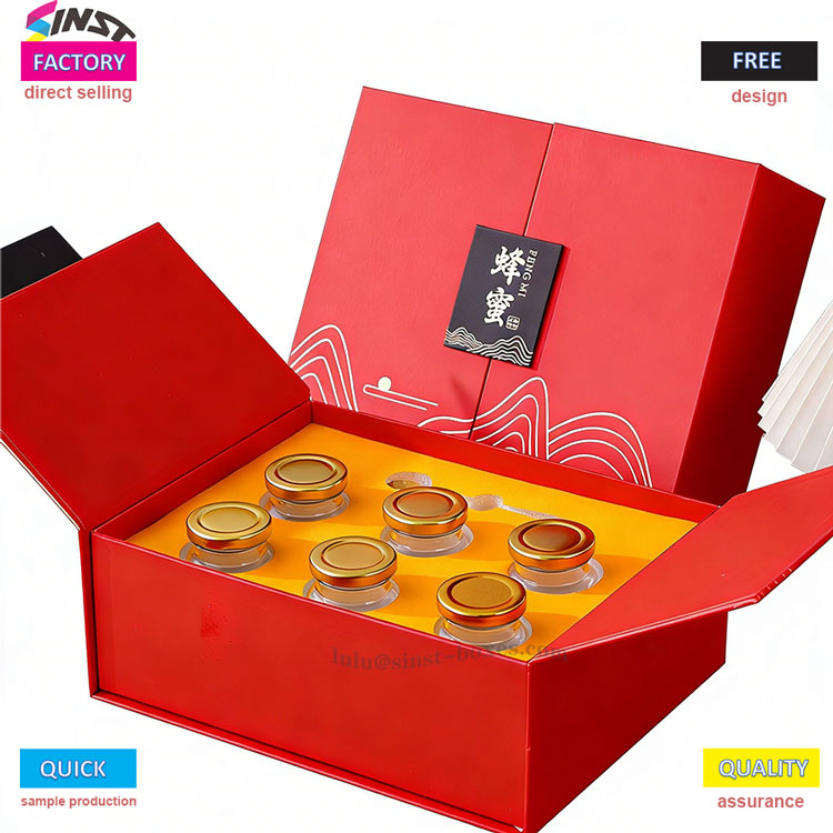 이 레드 허니 선물 상자는 우아한 물결 패턴과 고품질 하드 판지를 결합하고 접이식 구조로 보관 및 운반이 용이합니다. 허니 선물 상자는 다양한 유리병 크기(허니/토닉용)를 지원하며 내용물을 담을 수 있는 맞춤형 폼 인서트가 함께 제공됩니다. 유럽, 미국, 동남아시아 시장의 선물 선호도에 맞춰 명절 선물, 비즈니스 선물, 건강 제품 포장에 매우 적합합니다. 이 상자는 가볍고 스타일리시하며 비용 효율적이며 제품 가치를 높여줍니다.