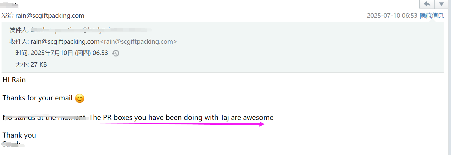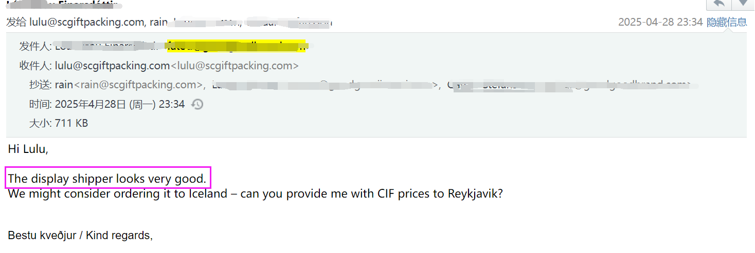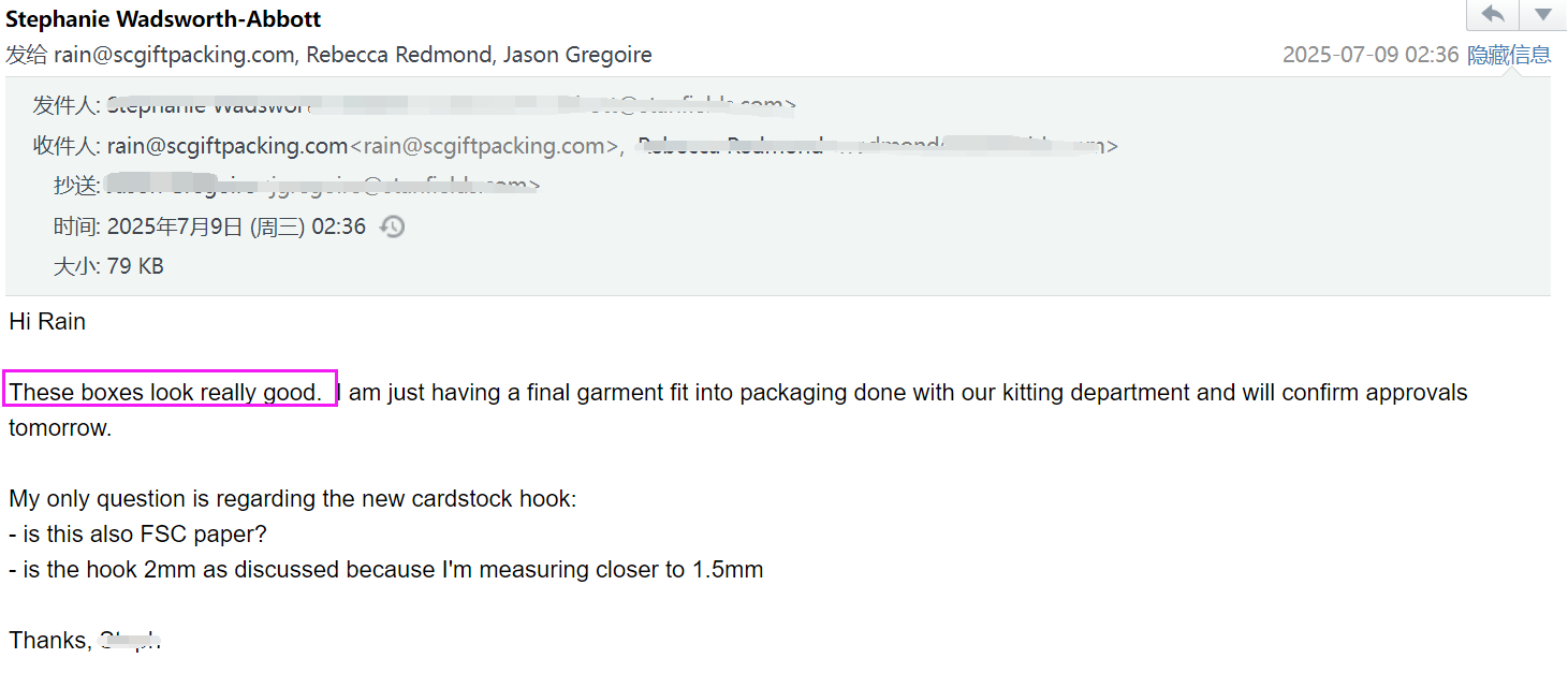 마침내 디자인을 이해하는 포장 공장을 찾았습니다! "- 미국 선물 브랜드의 책임자 인 Emily의 메시지