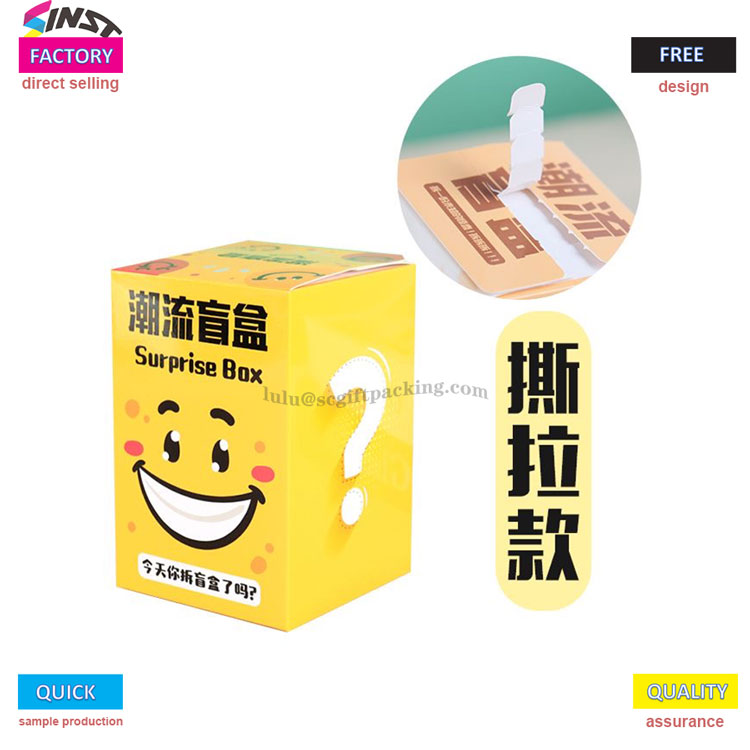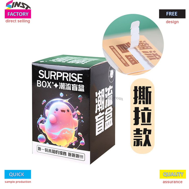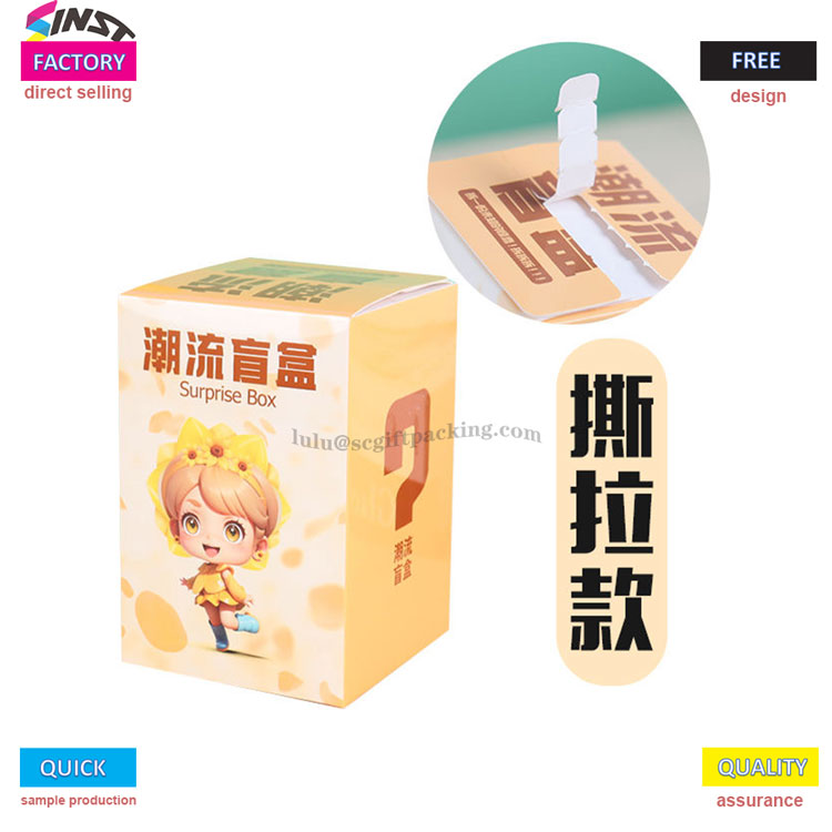 이것은 인스 타 그램 스타일과 높은 미학적 가치를 가진 트렌디 한 인형 블라인드 박스 찢어짐 카드 상자입니다. Tear Off 디자인은이 제품을 구매하는 고객에게 흥분하고 신비한 느낌을줍니다. 선물을 더욱 매력적으로 만듭니다! 이 블라인드 박스는 두꺼운 흰색 카드 재료로 만들어져 등급을 강조합니다.